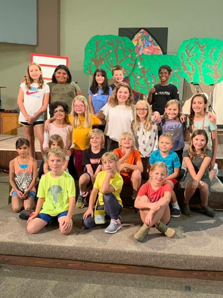 The last week of June, the children’s ministry team held a drama camp for third through sixth graders. Camp started each morning at 9:00 a.m. and concluded at2:30 p.m. Twenty children attended camp, 10 youth served as group “guides” or stage hands, and 14 adults volunteered their time to help the campers put together a melodrama by the end of the week: Come to the Table.